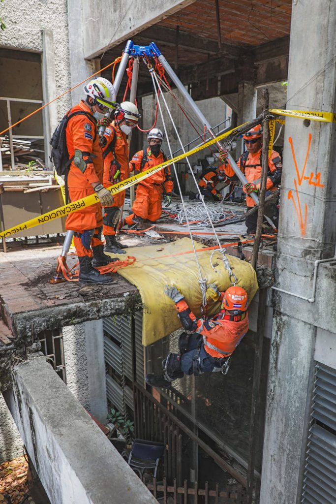 Durante el desarrollo de este ejercicio, los equipos ejecutaron maniobras especializadas de búsqueda, localización, estabilización y extricación de víctimas, mediante la aplicación de procedimientos técnicos USAR. Estas acciones incluyeron rompimiento controlado, levantamiento y estabilización de cargas, remoción de escombros y rescate en espacios confinados, bajo estrictos protocolos de seguridad.